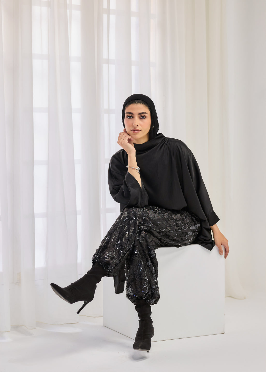 Glittery pants paired with a soft imported satin blouse, offering a balanced look of sparkle...