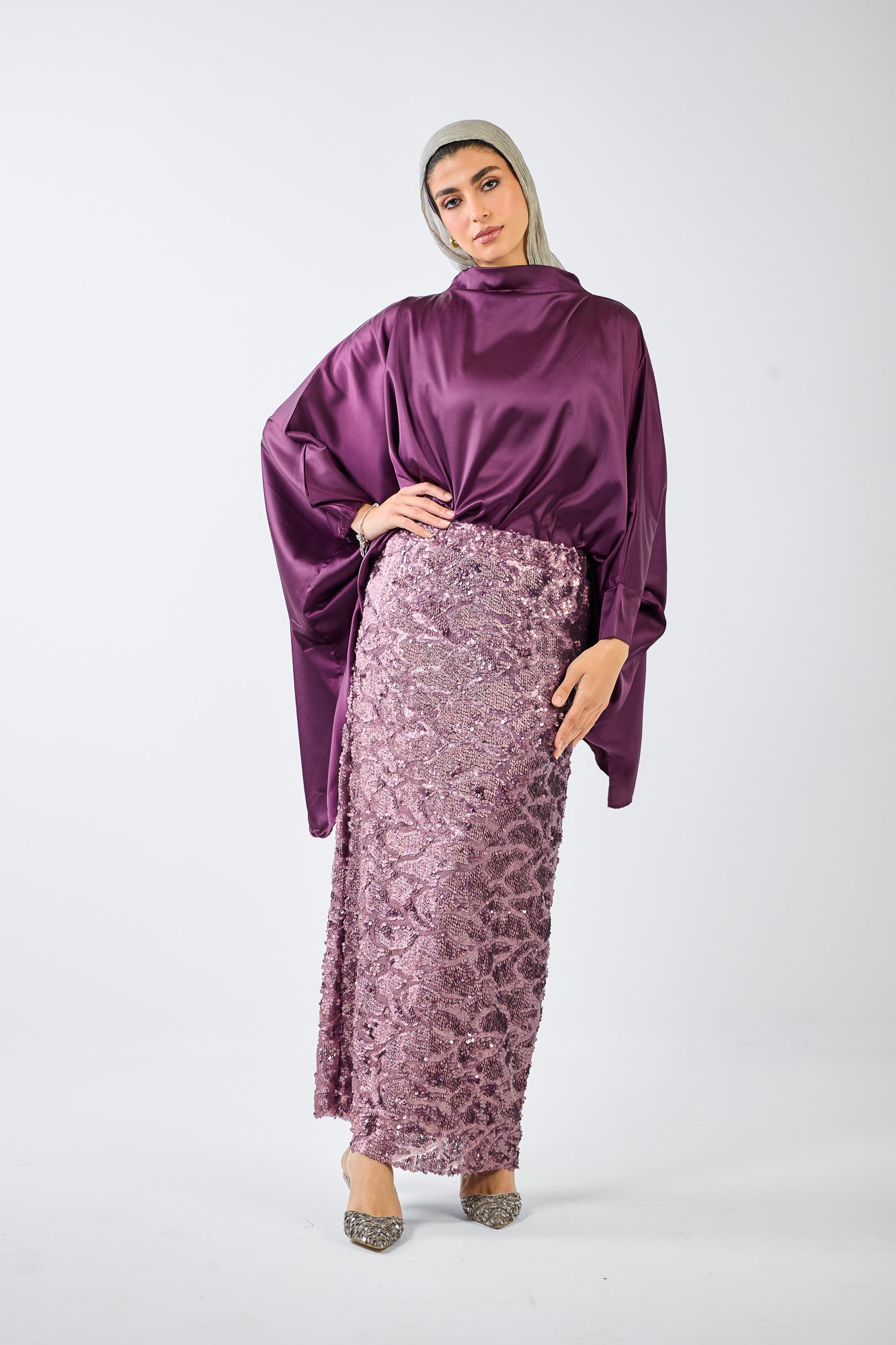 Glittery skirt paired with a soft imported satin blouse, offering a balanced look of sparkle and elegance for day or night wear.